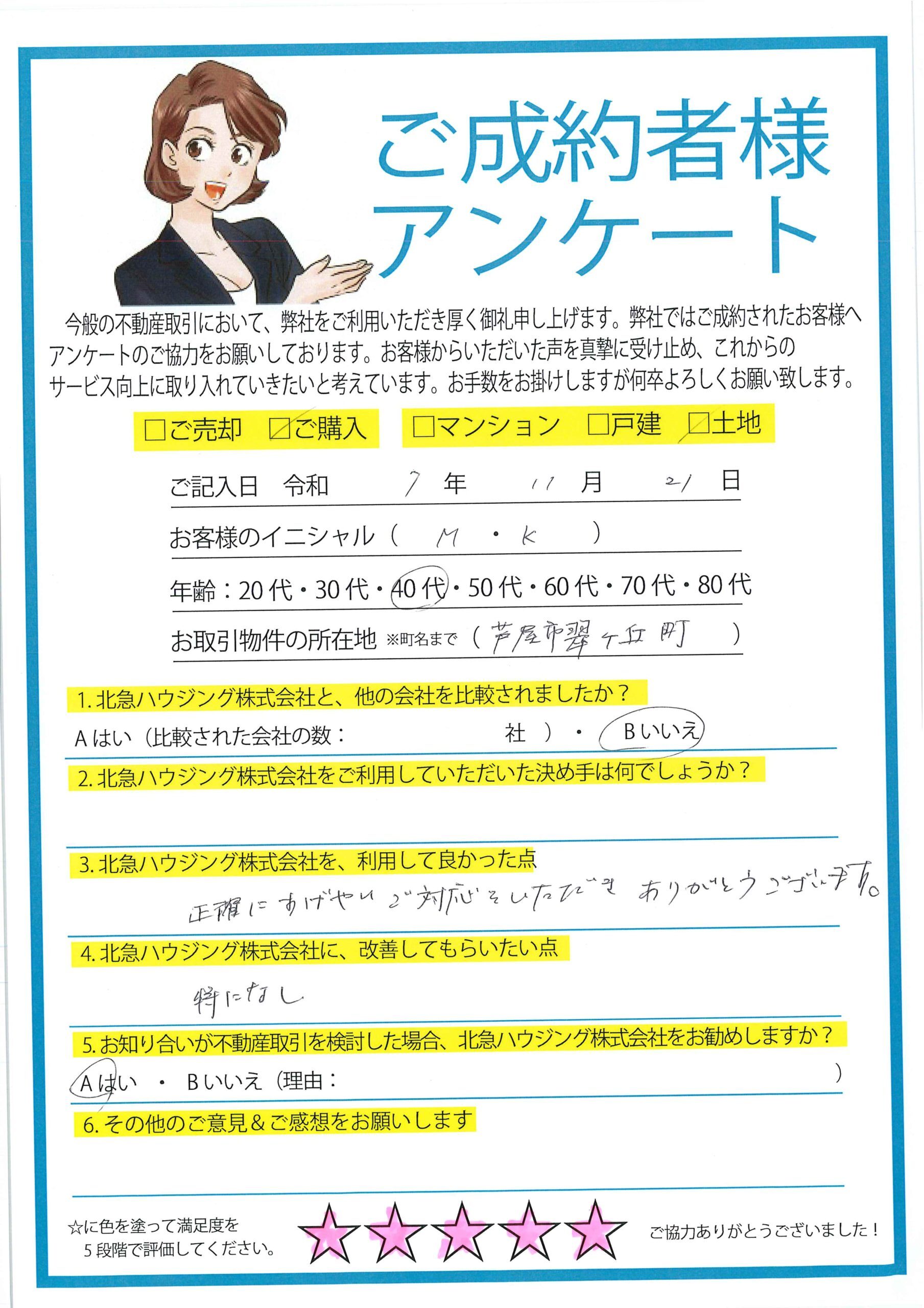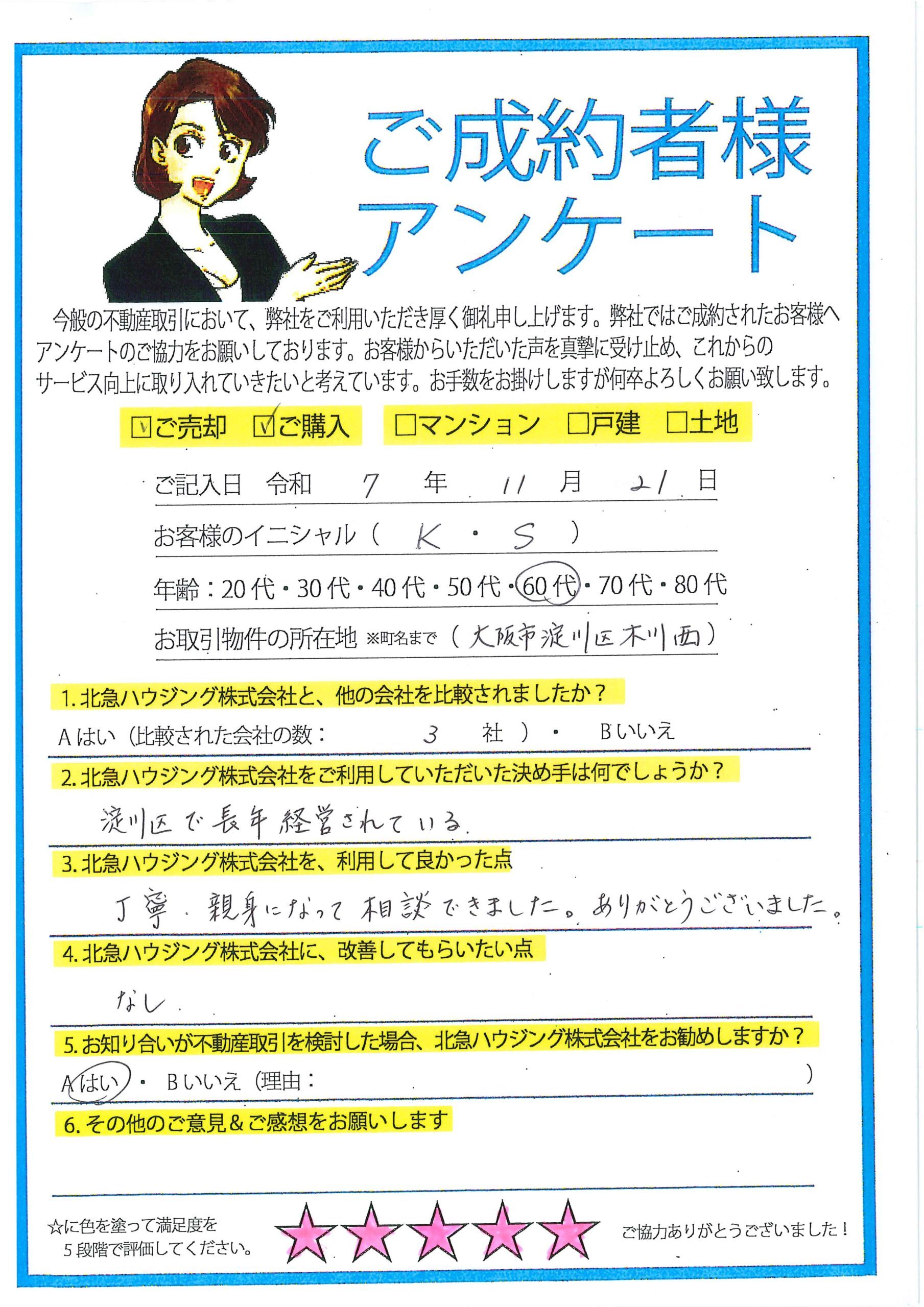 中古戸建ての売却を、北急ハウジングさんにお願いしました。ご縁があり無事に契約に至りました。担当の松岡さん(松坂大輔さん似)はスピード感を持って動いてくれました。打ち合わせの時も親身に話しを聞いて下さりありがとうございました。